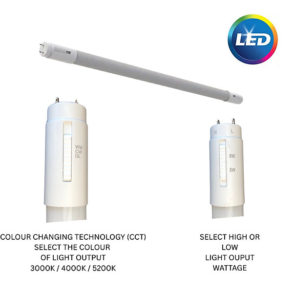 THE VERY LATEST IN LED TUBE TECHNOLOGY.4FT LED 18W TUBE CCTYOU SIMPLY SELECT THE COLOUR OUTPUT YOU NEED BY CHANGING THE SWITCH FROM WARM WHITE, COOL WHITE OR DAYLIGHT.THESE ARE A DIRECT REPLACEMENT FOR A STANDARD FLUORESCENT TUBE WHERE THE FITTING IS FITTED WITH A STARTER.THESE TUBES ALSO HAVE THE OPTION OF HIGH OUTPUT OR LOW OUTPUT ENABLING YOU TO HAVE BRIGHTER LIGHT OR SAVE ENERGY5 YEAR WARRANTY – ON ALL TUBESNO NEED TO BUY A CERTAIN COLOUR ANYMORE CCT (COLOUR CHANGING TECHNOLOGY) WILL GIVE YOU THE BEST OF ALL OPTIONS.4FT TUBE SWITCHABLE BETWEEN STANDARD OUTPUT 18 WATT AND LOW OUTPUT 9 WATT.SUITABLE FOR COMMERCIAL AND DOMESTIC APPLICATIONSLUMEN OUTPUT 18W IS 2500 LUMENSTHIS IS THE LATEST TO THE MARKET REVOLUTIONISING THE WAY WE BUY TUBES FROM NOW ON. SIMPLY SWAP THE TUBE AND REPLACE THE STARTER WITH THE LED FUSE WHICH IS ALSO SUPPLIED AND YOUR OLD FITTING WILL TAKE ON A WHOLE NEW OUTPUT AND SAVE YOU LOADS ON THE OLDER 18 WATT FLUORESCENT TUBE