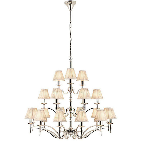 Avery Ceiling Pendant Chandelier Light–21 Lamp Bright Nickel & Beige Pleat Shade Technical Specification:The elegant 21 light pendant from the Stanford nickel range has beautifully curved arms and simple clean detailing. Its complemented by pretty, beige organza effect shades. Matching items available.Dimmable. Polished nickel & beige organza. Constructed from steel & fabric.SIZE: 1100-4000mm adjustable drop x 1150mm diameterSteel & fabricWEIGHT: 13.978 kgsBulb Description: 21 x 40W E14 candle.400 Lumens per Product.Bulb Not Included.IP20-This type of fitting offers no protection against liquids.It is suitable for use in the kitchen and around the home with the exclusion of bathrooms and toilets. You should not use this type of fitting outside the home.i00368
