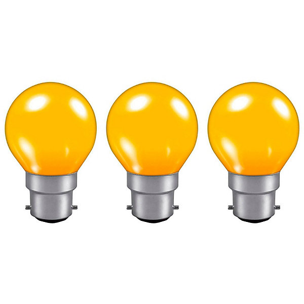 Amber 15W incandescent golfball (round) Colourglazed style light bulb with a BC-B22d bayonet (22mm) cap.Colourglazed light bulbs have a internal coloured coating which will not wear away and provides a strong and vibrant colour. These light bulbs are vacuumed filled so are ideally suitable for indoor and outdoor use.Please note that even though the light bulb itself is IP65 rated, it must be used in a suitable IP65 rated socket in order for it to be used outside safely.