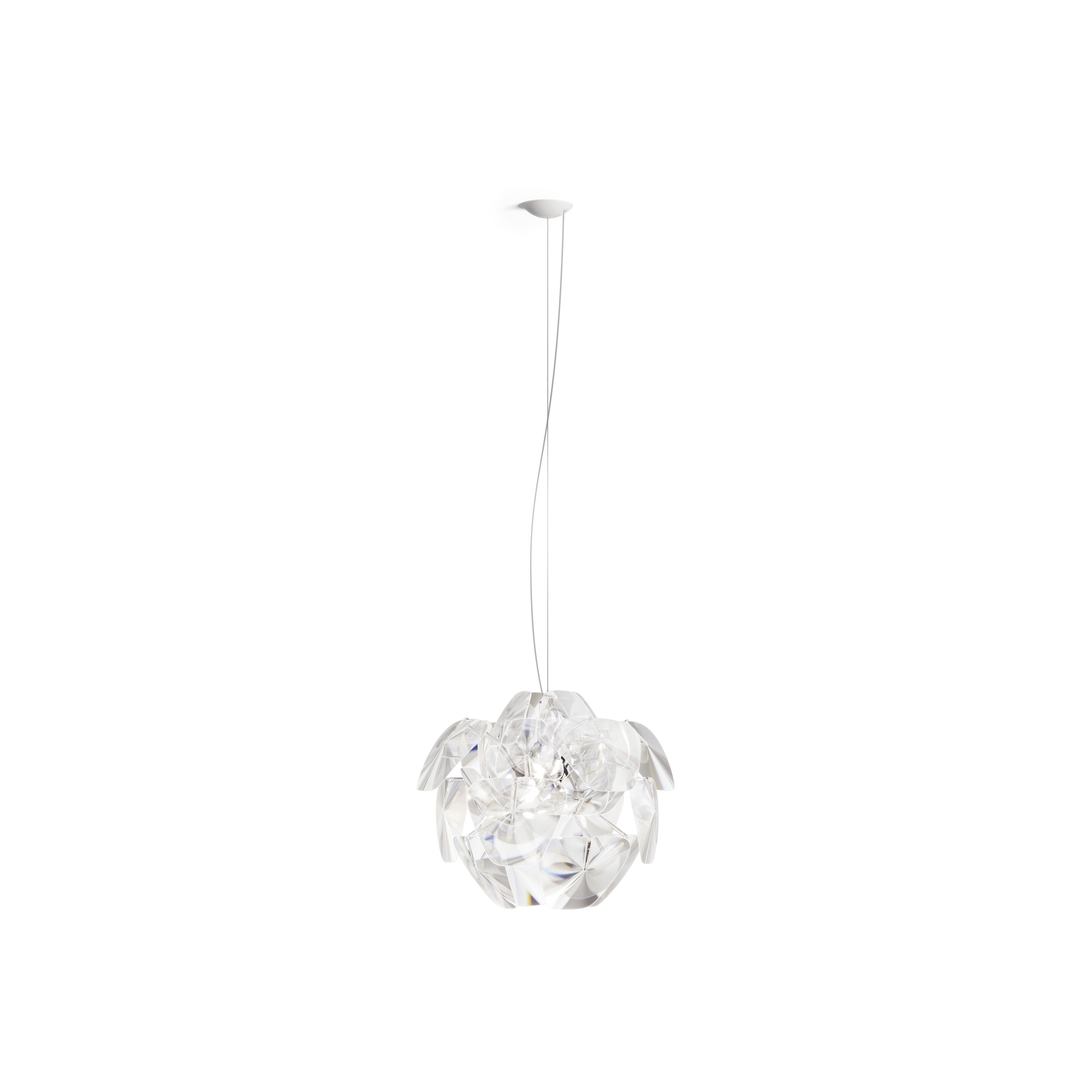 The Hope Pendant Light from Luceplan represents a contemporary approach to lighting, weaving together essential artistry with optimized lighting, ensuring a decorative impact with a striking aesthetic result. Pieces of thin methacrylate deliver a glass motif, delicate and inspiring, and clustered into a rounded yet fractured silhouette. Brilliant lighting shines through spaces between clear elements, offering a deliberately eclectic flavor.